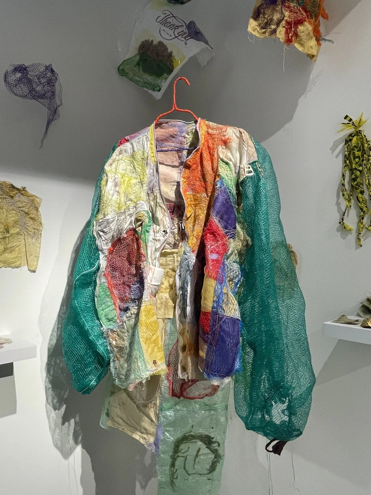 Plastic net, plants, dyed fabric, thread, metal tabs, sequins, beads, resin, paper.