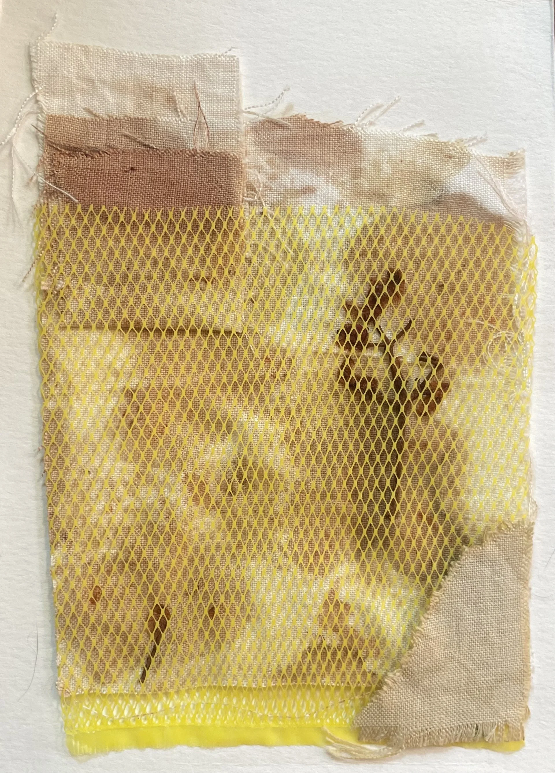 Marigold flowers, Plastic net, fabric dyed with marigolds , thread,